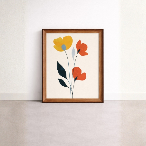 Abstract Floral Art Framed Wall Decor – A modern botanical illustration featuring warm yellow and orange floral elements with deep green leaves, set against a soft neutral background. Printed with high-quality precision and protected with a smooth laminated finish, this artwork is mounted in a premium natural wooden frame. Perfect for contemporary, Scandinavian, and minimalist interiors, adding warmth and artistic elegance to living rooms, bedrooms, offices, and hallways.
