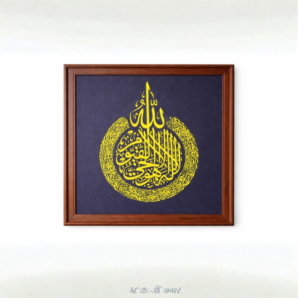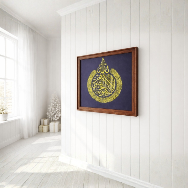 Enhance your home with this elegant Islamic calligraphy wall frame featuring the sacred name of Allah and beautifully detailed Ayatul Kursi artwork in a striking golden design on a deep navy blue background. The artwork is enclosed in a premium brown wooden laminated frame that adds a classic and sophisticated touch to any living room, bedroom, prayer area, or office space. Perfect for gifting during Ramadan, Eid, housewarmings, or special occasions.