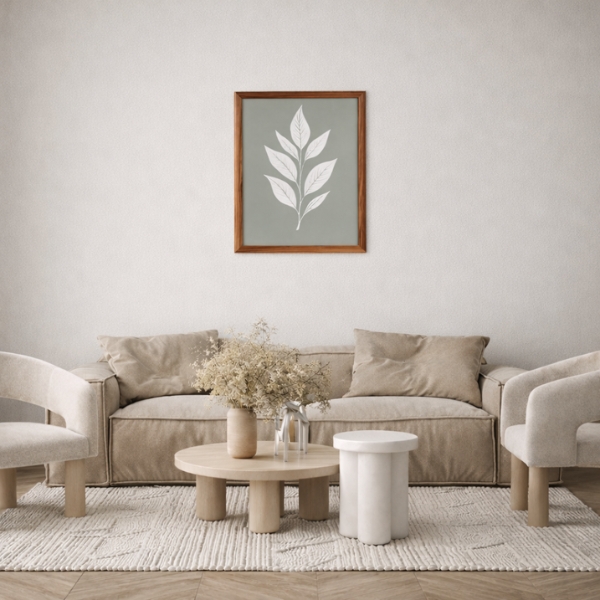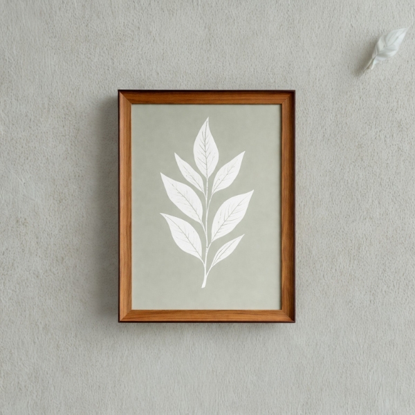 Botanical Leaf Minimal Wall Art – 12 x 16 inch laminated print featuring a soft sage green background with elegant white leaf illustration. Set in a warm natural wooden frame with a clean, modern finish, perfect for Scandinavian, minimalist, and contemporary interiors. Ideal for living rooms, bedrooms, offices, and cozy corners.