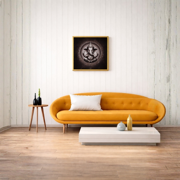 Lord Ganesha Monochrome Wall Art – 12 x 12 inch premium acrylic print featuring an elegant black and silver-toned artwork of Lord Ganesha with intricate circular detailing. Finished with a sleek glass-like acrylic surface and mounted in a luxurious gold frame, this spiritual artwork adds a sophisticated and divine touch to modern, contemporary, and traditional interiors. Perfect for living rooms, pooja rooms, offices, and gifting purposes.