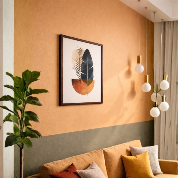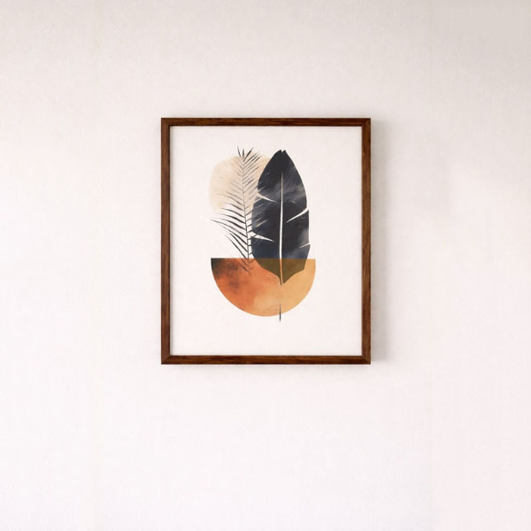 Bring a modern and calming touch to your space with this minimalist abstract feather artwork. Featuring elegant botanical feather shapes in neutral beige and deep black tones, balanced with a warm terracotta circular accent, this frame adds a stylish contemporary vibe to any room. Perfect for living rooms, bedrooms, offices, or minimalist interiors.