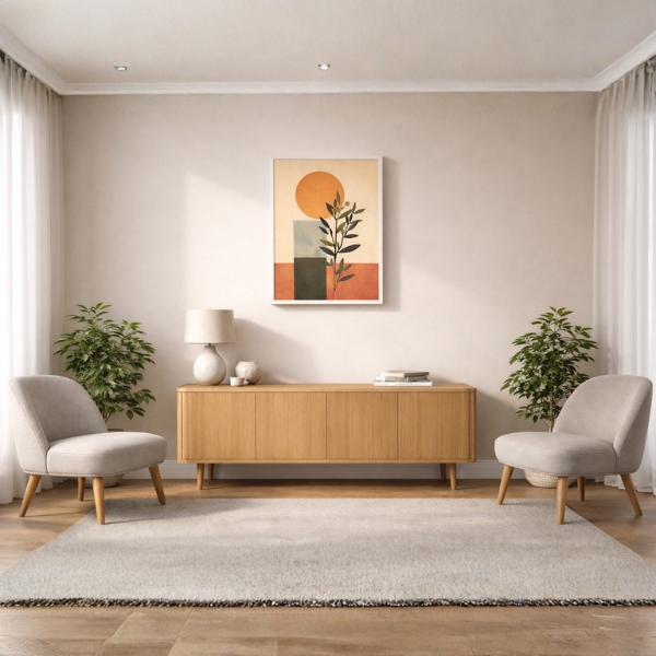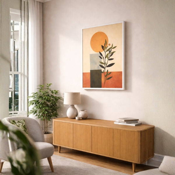 Enhance your space with this modern abstract wall art featuring a warm sunset-inspired circular motif combined with minimalist botanical elements. The earthy tones of terracotta, beige, olive green, and muted blue create a balanced and calming aesthetic, perfect for contemporary, Scandinavian, or boho-style interiors. The artwork is enclosed in a sleek white laminated frame that adds a clean, refined finish while ensuring durability. Ideal for living rooms, bedrooms, offices, or studio spaces.