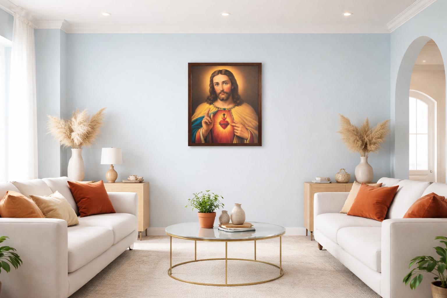 Enhance your home with this beautifully designed Sacred Heart of Jesus laminated wall frame. Featuring a vibrant and detailed depiction of Jesus with the radiant Sacred Heart, this artwork brings a sense of peace, devotion, and spiritual warmth to any space. The elegant brown laminated frame adds a classic touch, making it perfect for living rooms, prayer rooms, offices, or gifting purposes. The high-quality print ensures long-lasting color clarity and durability.