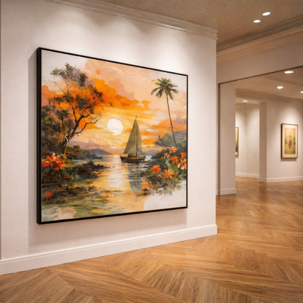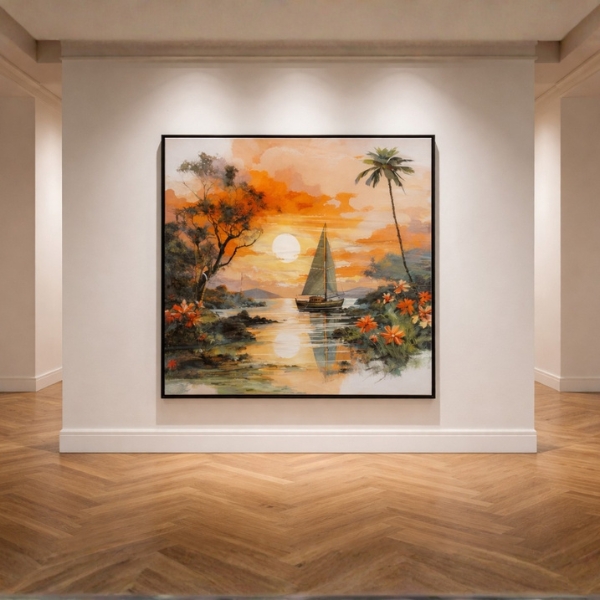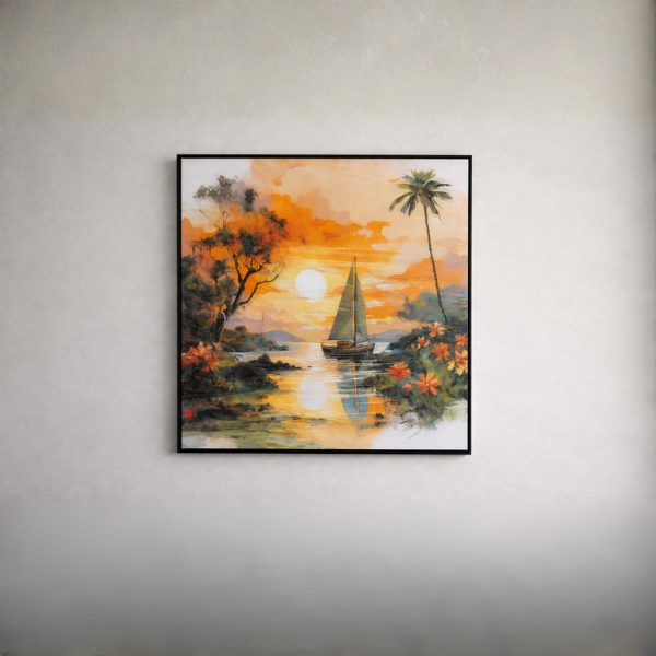 Bring warmth and serenity to your space with this beautiful sunset sailboat landscape wall art. Featuring a calm river scene with a sailing boat, glowing sunset reflection, palm trees, and vibrant floral accents, this artwork adds a peaceful tropical vibe to any room. The rich orange and golden hues create a cozy and elegant atmosphere, making it perfect for living rooms, bedrooms, offices, or hallways. Finished with a sleek black laminated frame, it offers a modern and clean look that complements contemporary interiors.