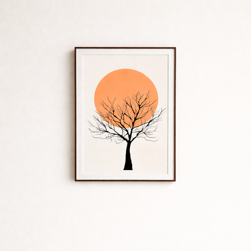 Sunset Tree Silhouette Wall Art – A minimalist art print featuring a bold black tree silhouette set against a warm orange sun backdrop. This elegant design is mounted with a white mat border and enclosed in a premium wooden laminated frame, making it perfect for modern, Scandinavian, and contemporary interiors. The soft neutral background and striking contrast create a calm yet eye-catching focal point for any space.
