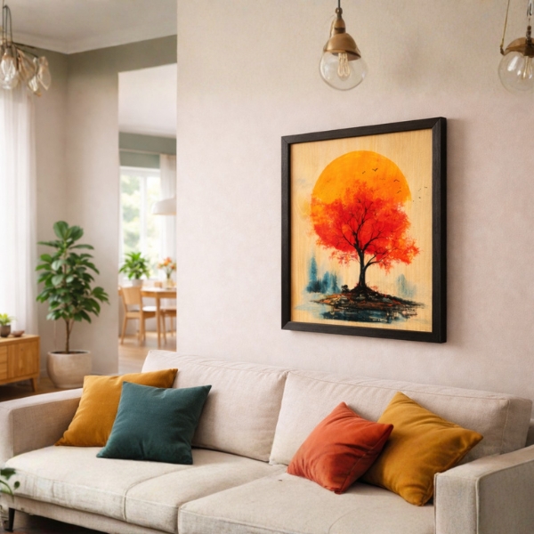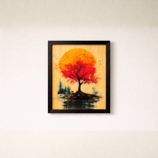 Enhance your space with this beautifully crafted laminated wooden wall frame featuring a vibrant sunset tree artwork. The design showcases a striking red-orange tree silhouette against a glowing sunset backdrop, reflected over calm water for a serene and artistic appeal. Printed on a natural wood-textured base and enclosed in a sleek black frame, this artwork adds warmth and elegance to living rooms, bedrooms, offices, and hallways. Perfect for modern, minimalist, and contemporary interiors.