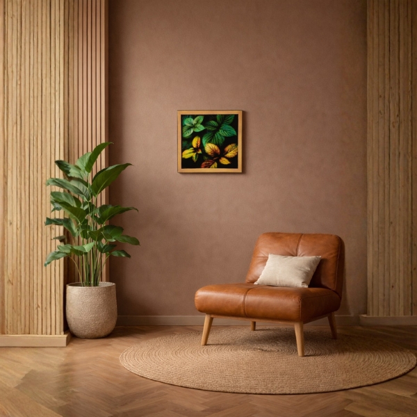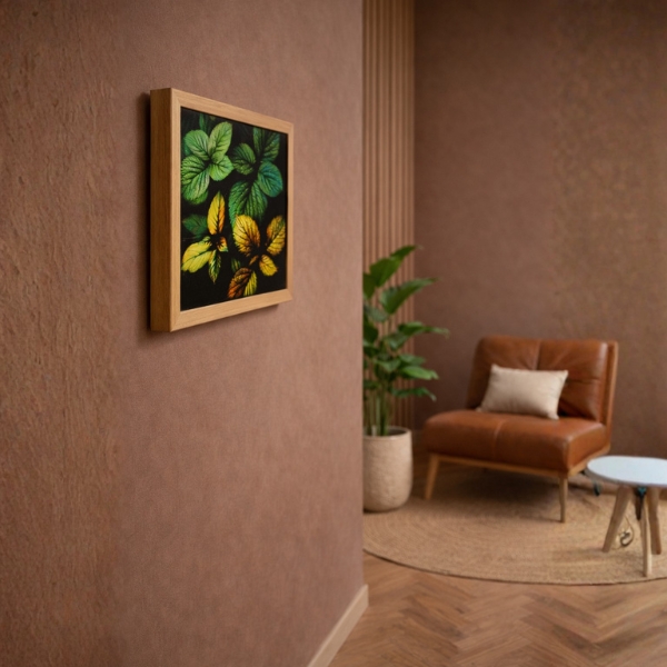 Vibrant Tropical Leaves Wall Art – 12 x 12 inch premium acrylic print featuring richly detailed green and golden foliage against a deep black background. Finished with a sleek glass-like surface and enclosed in a natural wooden frame, this artwork adds a bold, elegant touch to modern, nature-inspired, and contemporary interiors.
